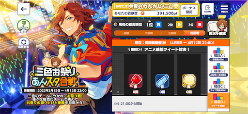 さて最近のあんスタでの自分の関心ごとは、Twitterのフォロワーさんにはバレバレですね。あんスタ合戦にがっつり参加しています。黄のわたがしです。昨日終了した3回戦は特にスクショの対決がありましたね。自分では1日10枚をノルマに設定して、撮りためたスクショをこれでもかと放出しました。タイムラインをいっぱいにしてしまい失礼しました。